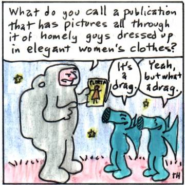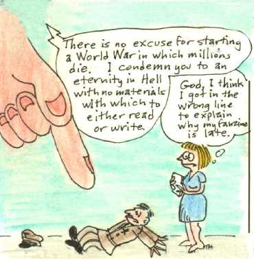 I’ve drawn hundreds of cartoons on postcards and sent them to family, friends, and fan editors. They have ended up on refrigerators, in file folders, in drawers, and in shoeboxes in closets. Some, however, appeared in print in fanzines. Seeing them published bothered me at first because the characters didn’t have the polish of those in my finished cartoons and my handwriting was sometimes difficult to read, even for me, and I thought someday I’d go back and make them into finished cartoons. But I never did because I was always coming up with new ideas. Now I am flattered and amused that someone published them, unconcerned that they reveal the cartoonist in the rough. And I am also careful to send only finished cartoons to fan editors. Here are eight postcard cartoons that saw print.