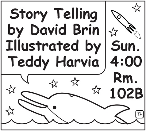 Someone with programming for Denvention, the 2008 World Science Fiction Convention in Denver, had the genius to put David Brin (http://www.davidbrin.com/), Frank Wu (http://www.frankwu.com/), and me on an illustrated storytelling panel opposite the invitation-only pre-Hugo party when many of the other illustrious pros and fans were occupied and unavailable for panels. Fans packed the large room and together the three of us entertained them into a raucous frenzy that reverberated off the walls.