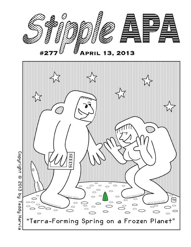 I’ve drawn hundreds of cartoons on postcards and sent them to family, friends, and fan editors. They have ended up on refrigerators, in file folders, in drawers, and in shoeboxes in closets. Some, however, appeared in print in fanzines. Seeing them published bothered me at first because the characters didn’t have the polish of those in my finished cartoons and my handwriting was sometimes difficult to read, even for me, and I thought someday I’d go back and make them into finished cartoons. But I never did because I was always coming up with new ideas. Now I am flattered and amused that someone published them, unconcerned that they reveal the cartoonist in the rough. And I am also careful to send only finished cartoons to fan editors. Here are eight postcard cartoons that saw print.